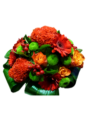 Un bouquet rond aux couleurs éclatante !  Le ton oranger du bouquet lui donne un effet vibrant et plein de vie au lieu où il rayonnera.